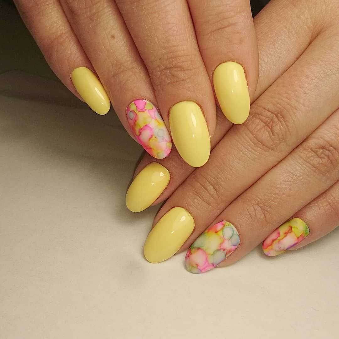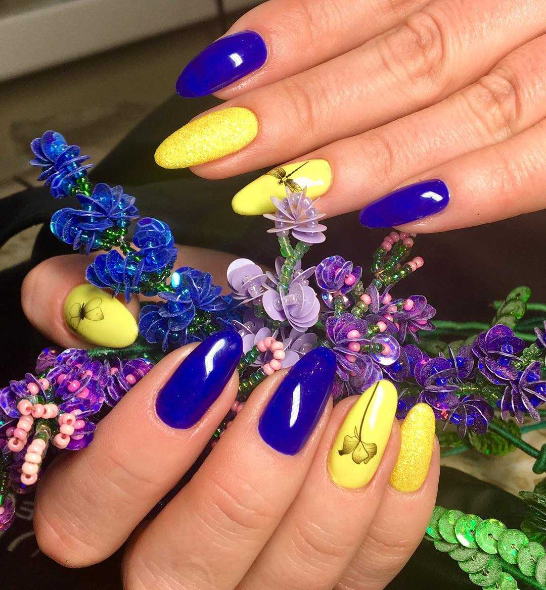 Модный тандем с жёлтым является наглядной демонстрацией тепла, солнца и лета. Это идеальное решение для любителей красочных идей маникюра. Яркие веточки мимозы, милые ромашки, горошки и клеточки, а также однотонное покрытие выглядят невероятно жизнерадостно и станут идеальным дополнением воздушного летнего лука.