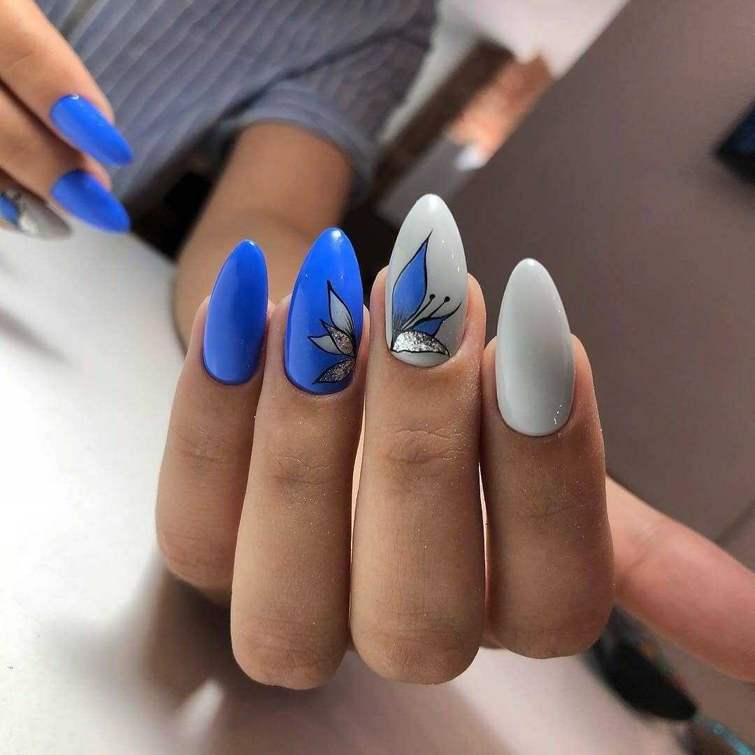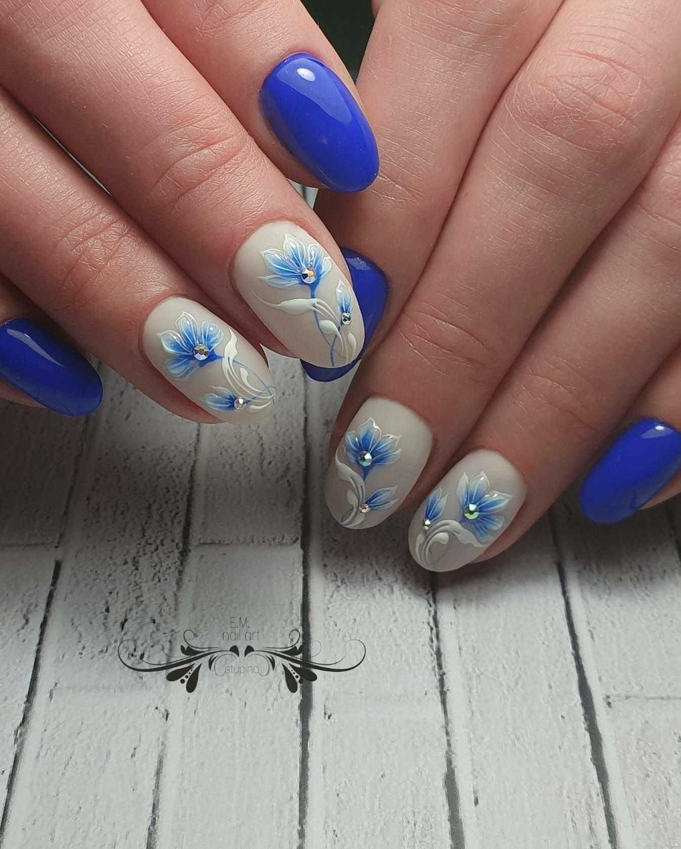 Цветочный рисунок едва ли не самый популярный в мире нейл-арта. Его выбирают круглый год, сочетают с самыми разными вариантами дизайна. Это и делает его максимально универсальным. Крупные, объемные бутоны чаще всего дополняют яркий маникюр. Он выглядит особенно эффектно и никогда не остается без внимания. Если же необходимо более скромное оформление, то лучше дополнить его тонкими веточками. Благодаря чему маникюр получается сдержанным и отлично подходит даже на каждый день. Также отлично смотрятся цветы в синем цвете на нейтральной основе. Такой дизайн не слишком яркий и за счет этого сочетается практически с любым образом.