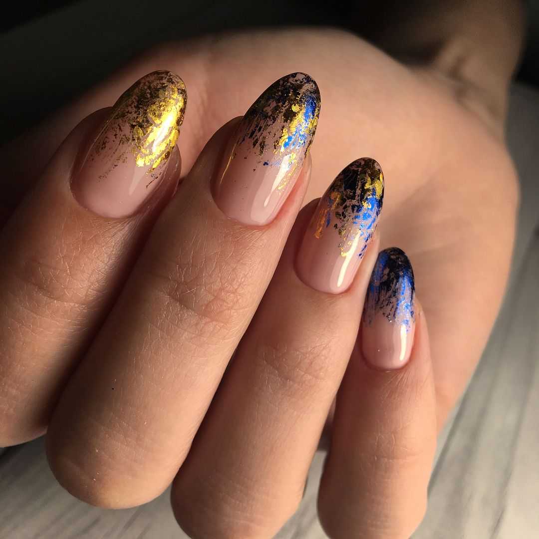 Это разновидность торжественного маникюра, для создания которого используют шеллак, матовый финиш, глиттер, гелевый полимер или обычный лак. Чтобы золотистый декор смотрелся ярко и лаконично, следует придерживаться рекомендаций всемирно известных стилистов: