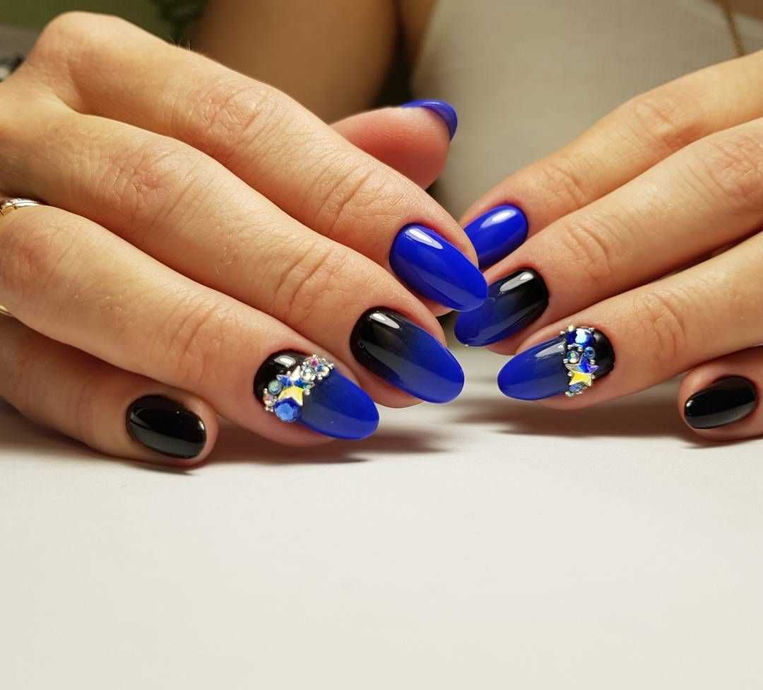 Не менее оригинально и привлекательно смотрится сочетание в маникюре голубого и синего лака. Удивлены? Поверьте, не смотря на «родственные связи» и принадлежность к одному цветовому кругу, с этими оттенками можно создать невероятные шедевры. Это могут быть вариации однотонного глянцевого или матового нейла с дополнениями в виде страз или блёсток, вертикальная или горизонтальная растяжка, маникюр с рисунками и всевозможными узорами. При этом элементы декора могут полностью дублировать цвет покрытия или наоборот, контрастно отличаться.