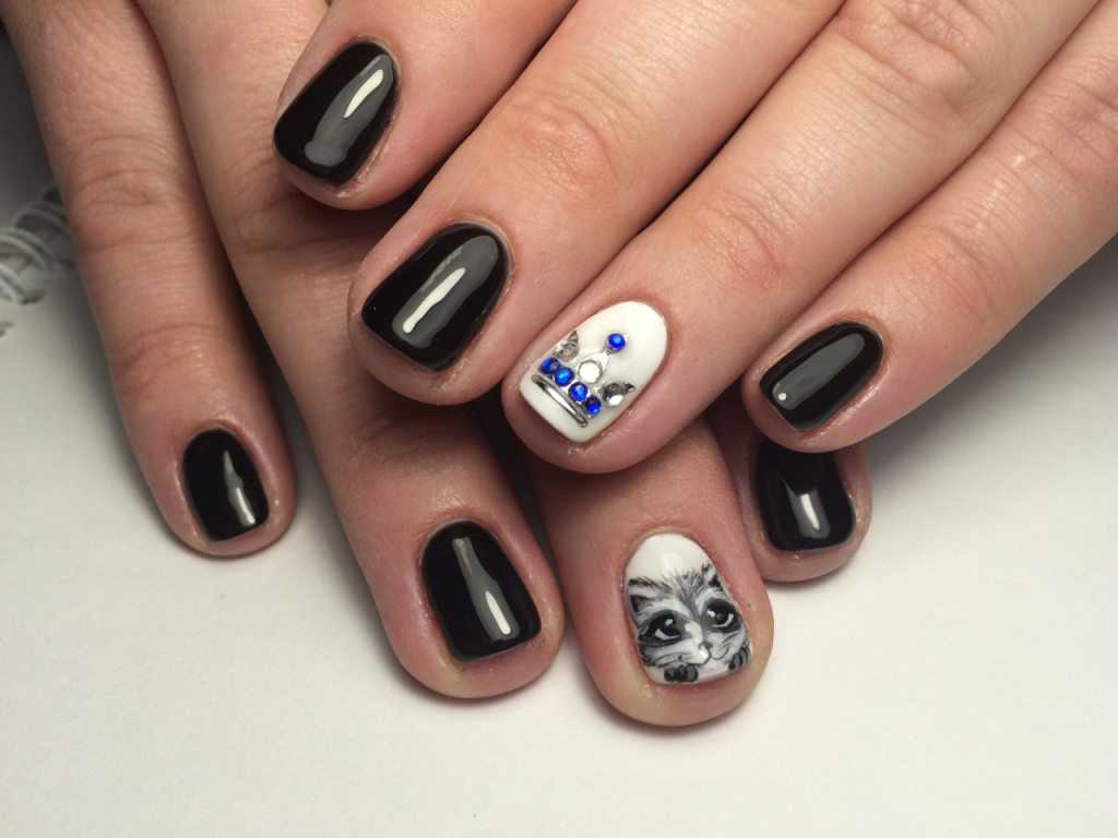Отличный вариант на короткую длину ногтей – модный лунный дизайн: однотонный базовый цвет гель-лака плюс луна у основания ногтя прорисовывается белым цветом или выкладывается мелкими стразами. Зрительно увеличивает размер небольших ногтей гель-лак «кошачий глаз», который отличается глубиной и многомерностью цвета и допускает умеренное украшение нескольких ногтей стразами.