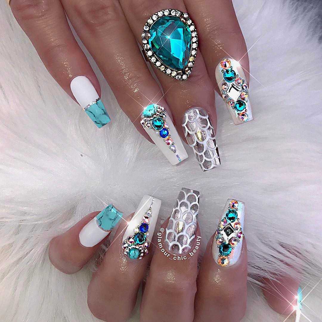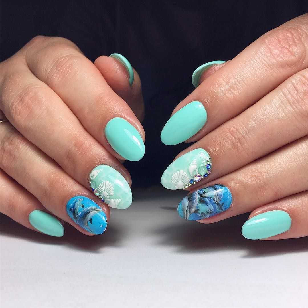 Отдельное место в летнем нейл-дизайне занимает морской маникюр, для его воплощения выбирают преимущественно многочисленные оттенки зеленого, синего и голубого гель-лаков. Дополняют маникюр стразами, морскими рисунками с кораблями, якорями, пальмами, рыбками, дельфинами, ракушками.