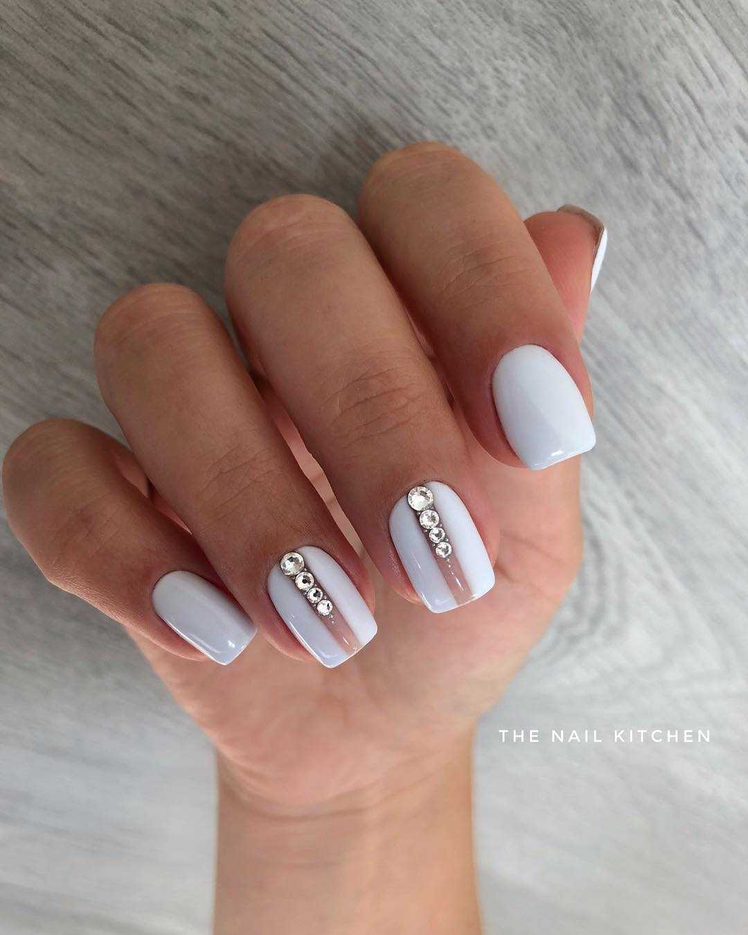 Классический белый маникюр с переливающимся декором