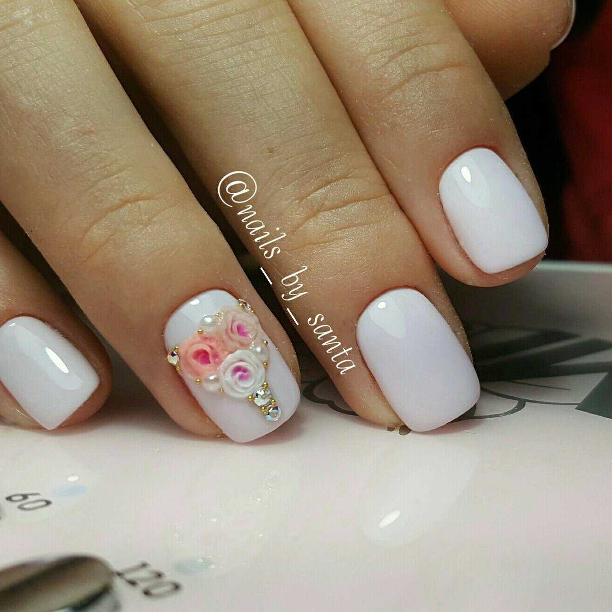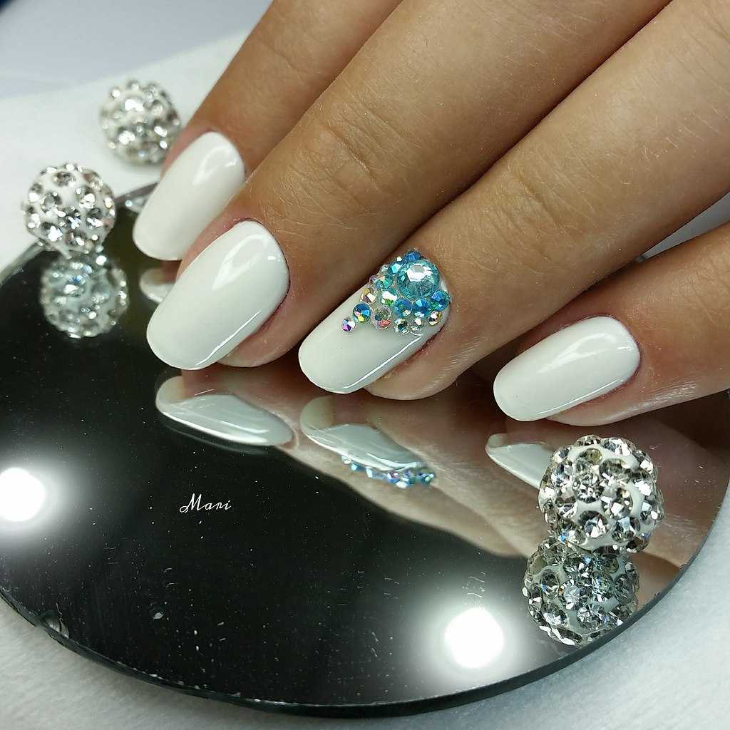 Освежить и разнообразить маникюр в белом исполнении можно при помощи переливающихся кристалликов. Если хочется получить нежный, легкий или романтический маникюр, то стильный белый дизайн с кокетливыми стразами станет самым утонченным и подходящим вариантом. Такой декор наиболее часто пользуется популярностью в выполнении свадебного дизайна. При помощи игривых кристаллов выделяют улыбочку французского маникюра или основание лунки, сочетают с объемными рисунками, выполняют легкие узоры. Таким способом можно смело воплотить в реальность все свои заветные мечты сказочного маникюра.