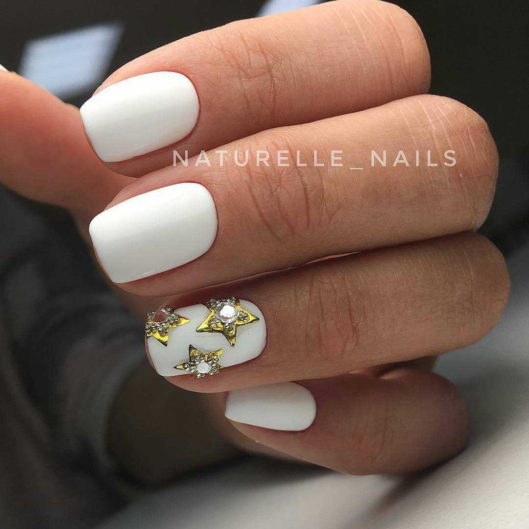 Классикой летнего маникюра можно смело назвать чистый белый гель-лак на ногтях любой длины и со вкусом расположенные золотистые, серебристые или цветные стразы. Белый гель-лак прекрасно сочетается с загорелой женской кожей, подходит ко многим летним образам. Более консервативные и сдержанные девушки выбирают для летнего маникюра нюдовые оттенки гель-лака и скромное количество страз в дизайне.
