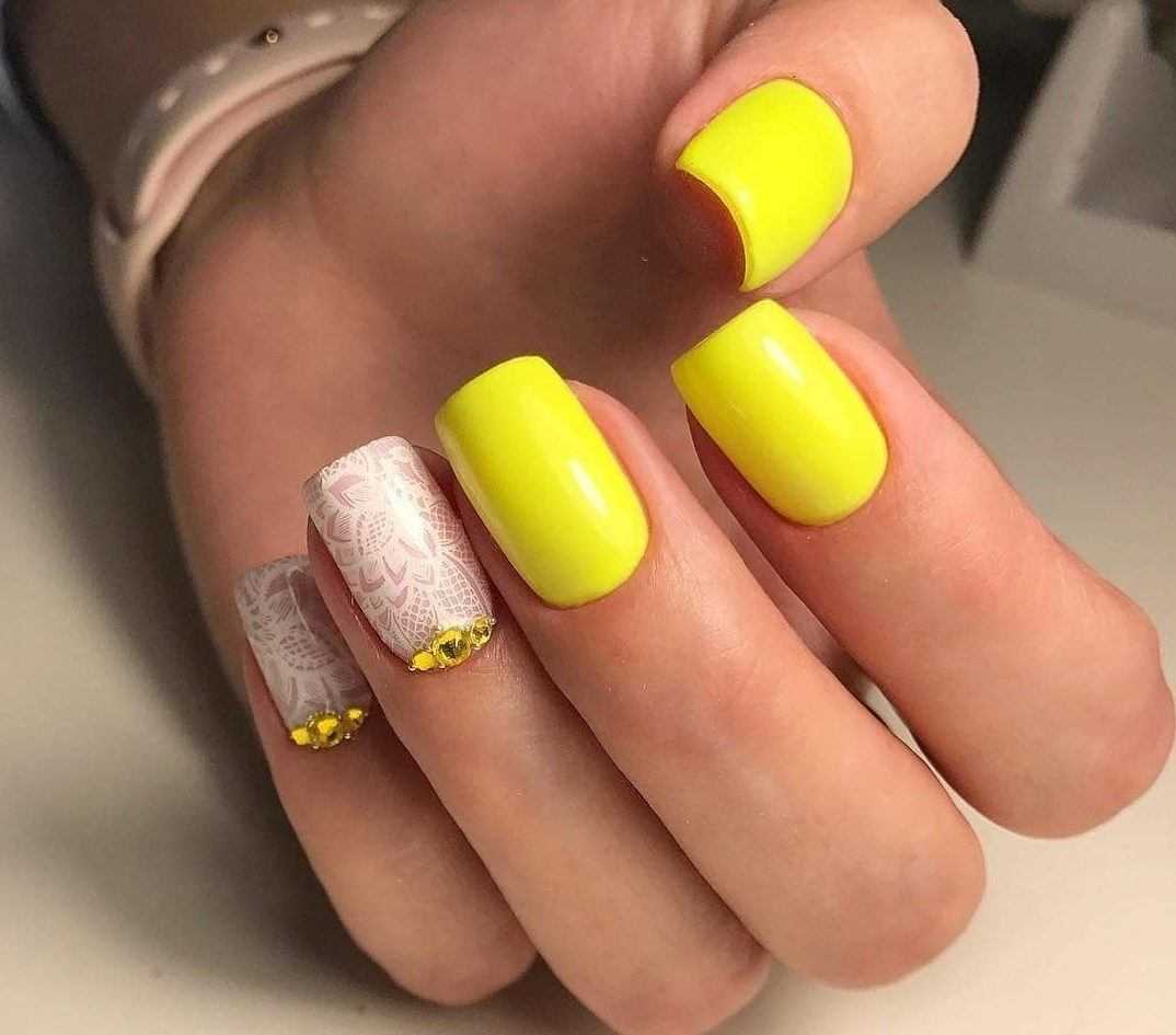 Маникюр для летнего сезона – это почти всегда яркие и насыщенные цвета, смелый и непредсказуемый декор, традиционные для этого времени года морские, фруктовые, цветочные идеи дизайна. Тренд этого сезона – летний яркий маникюр с использованием двух или трех неоновых цветов, выполненный в технике градиент или омбре с точечными акцентами из сияющих стразинок. Один из самых модных цветов этого сезона – желтый и все его оттенки. Ярко-желтый гель-лак в сочетании с черным дизайном, дополненный стразами таких же оттенков, никого не оставит равнодушным.