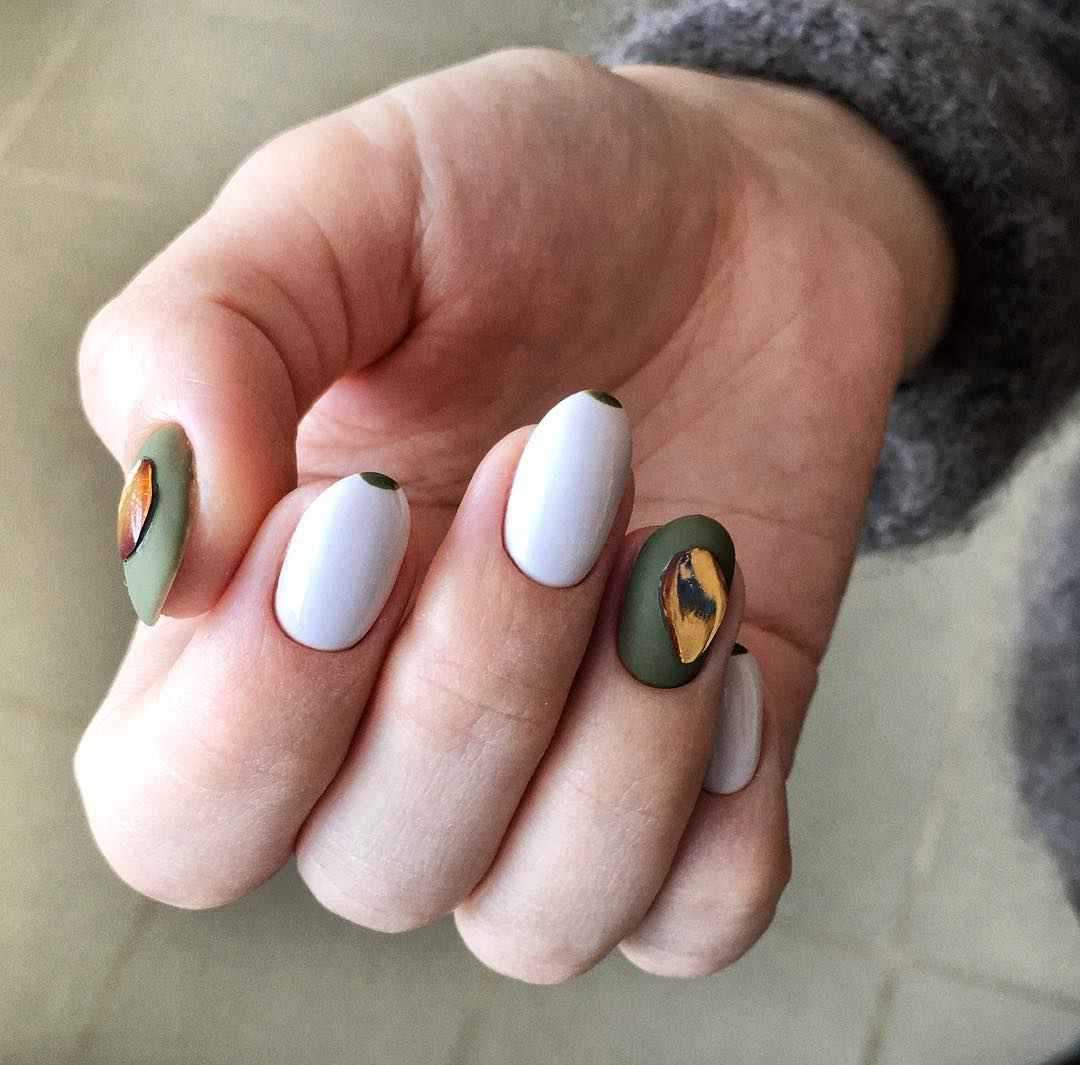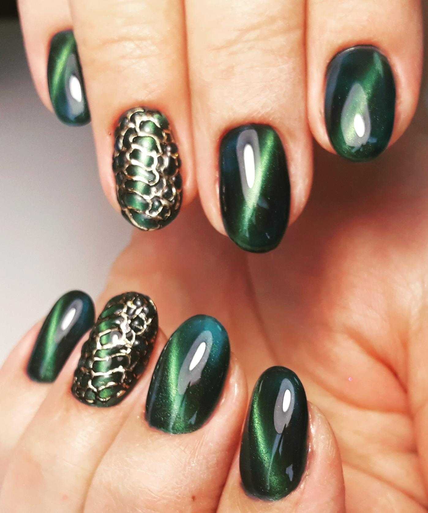 Изумрудный зелёный можно сочетать на ногтях с «кошачьим глазом». Ногти средней длины или длинные пластины смотрятся с изумрудным наиболее привлекательно. Оригинальный салатовый станет чудесным решением на каждый день. Оливковый максимально проявляет себя в однотонном маникюре. Нескольких золотистых деталей для таких ноготков будет вполне достаточно. Оттенки в стиле хаки или «камуфляж» можно обыгрывать в самых разных вариациях оформления.