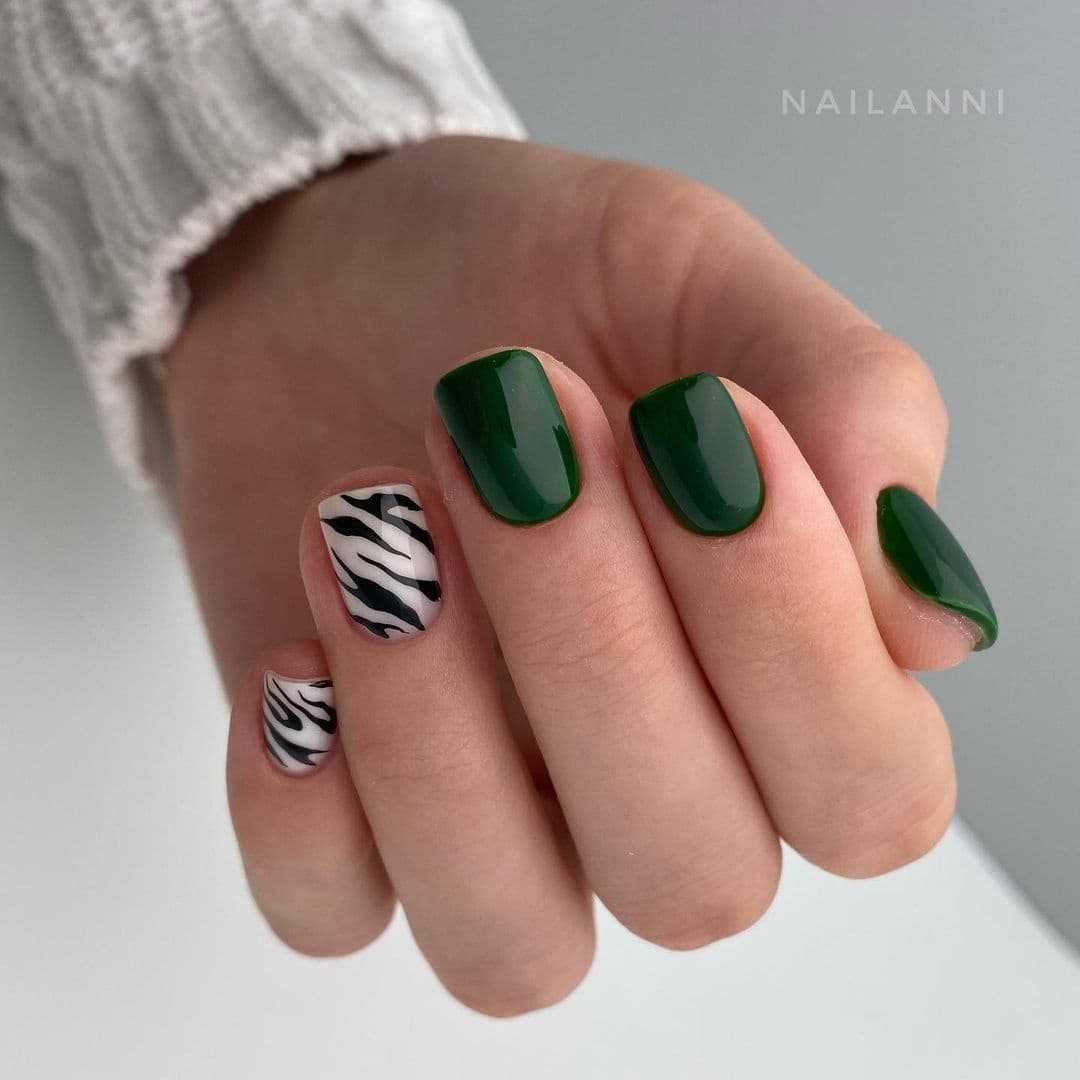 Темно-зеленый оттенок чаще всего выбирают для холодного времени года – осени или зимы, ранней весны. Но им также можно дополнить и яркий летний маникюр, прорисовывая им отдельные элементы или оттеняя более насыщенные, сочные цветовые «пятна».