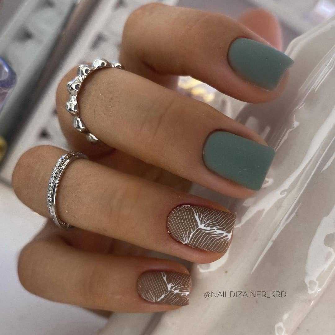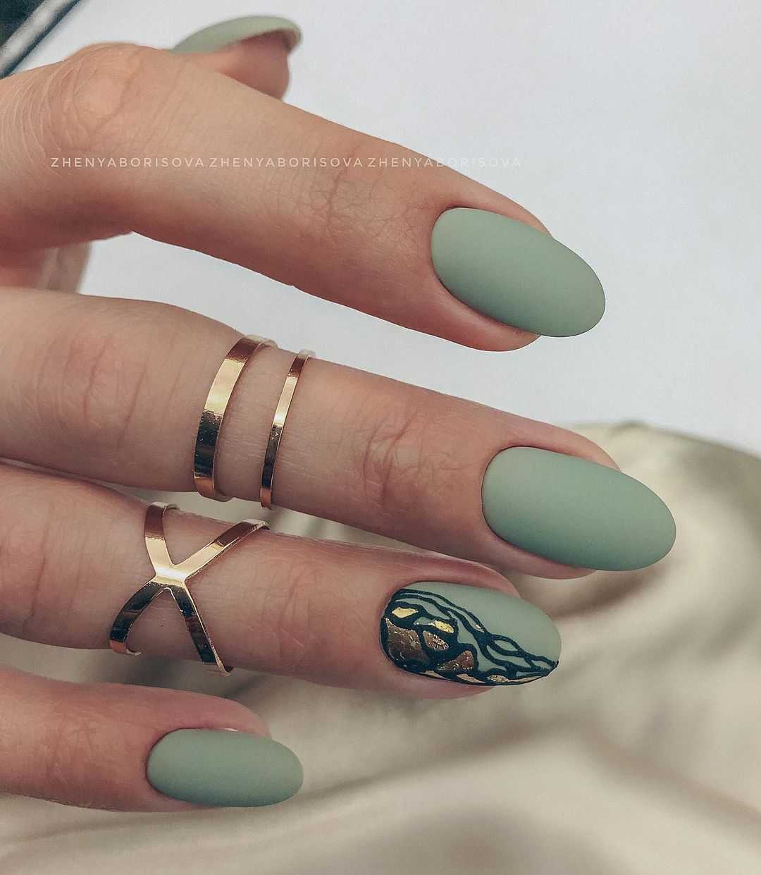 Любителям однотонных маникюров 2022 предлагает сочетать разные текстуры. Выкрасите ногти в любимые оттенки зелёного и покройте матовым топом.