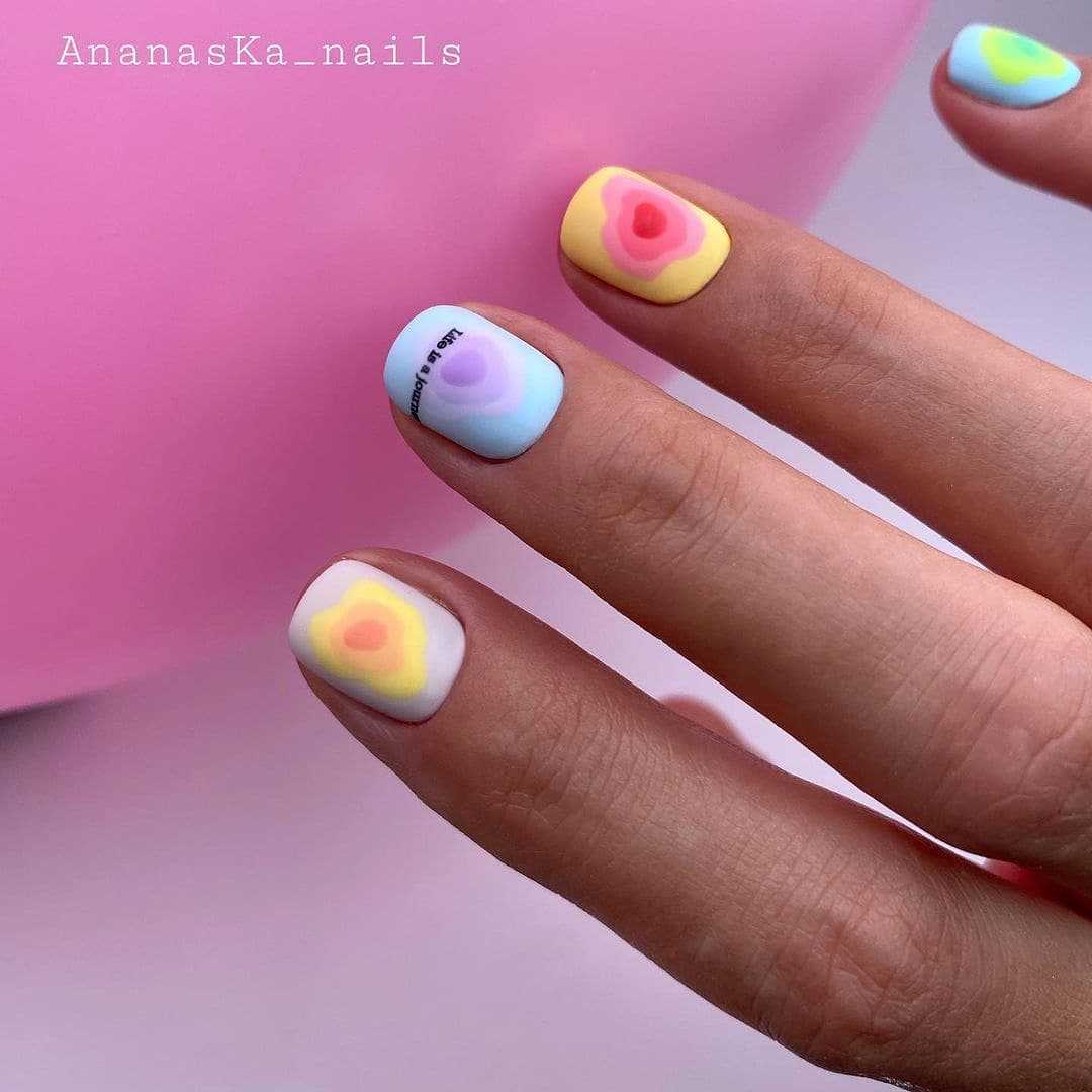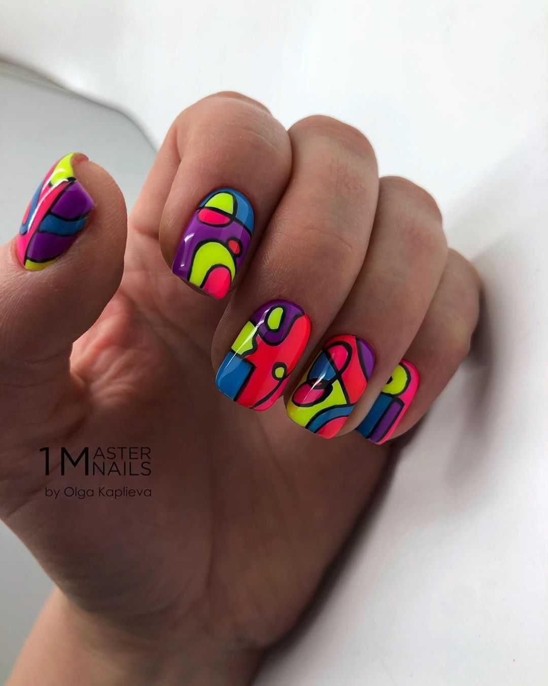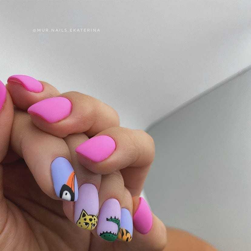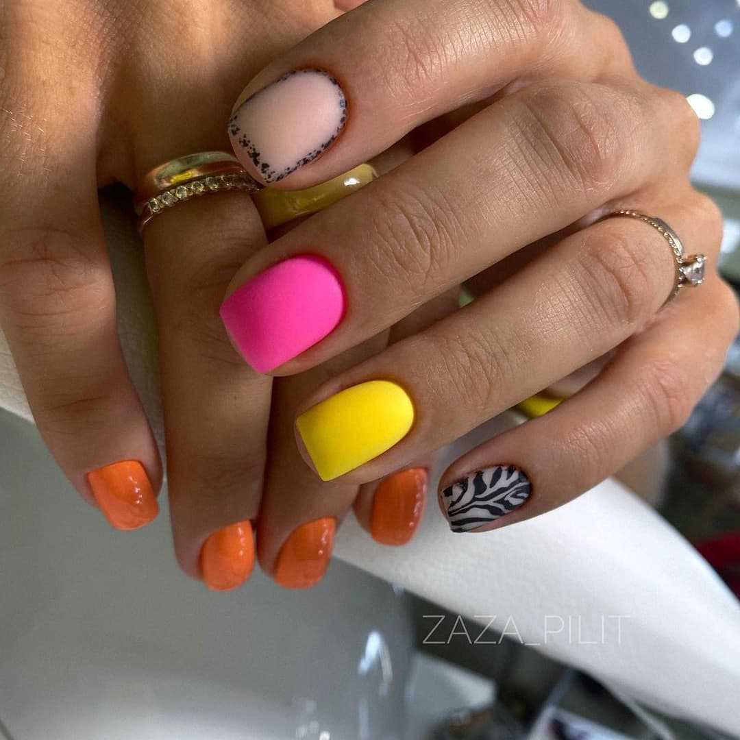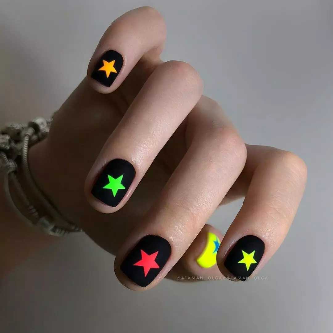 Оригинально и свежо смотрятся матовые поверхности в неоновых цветах, глиттерные ноготки или минимализм.