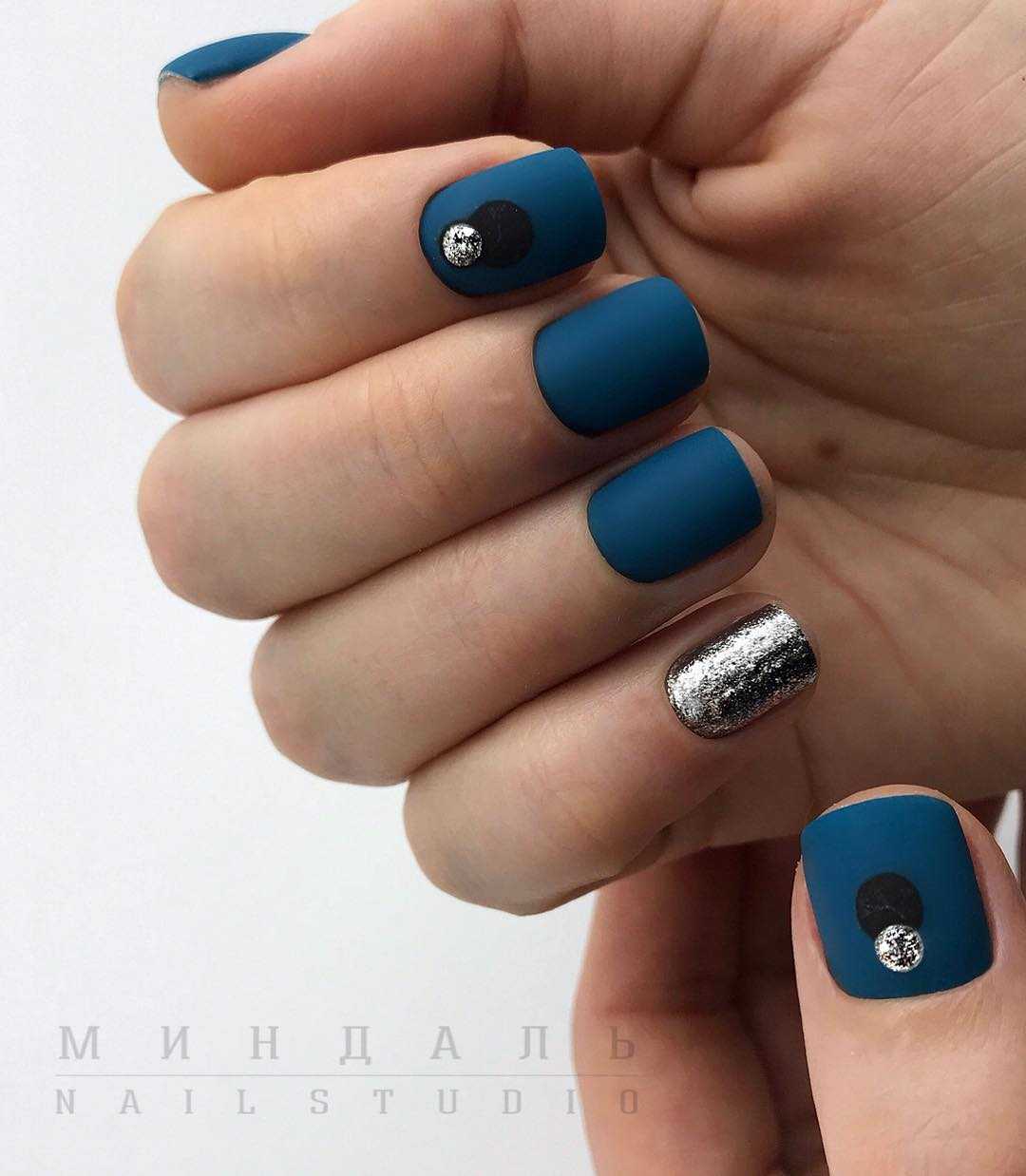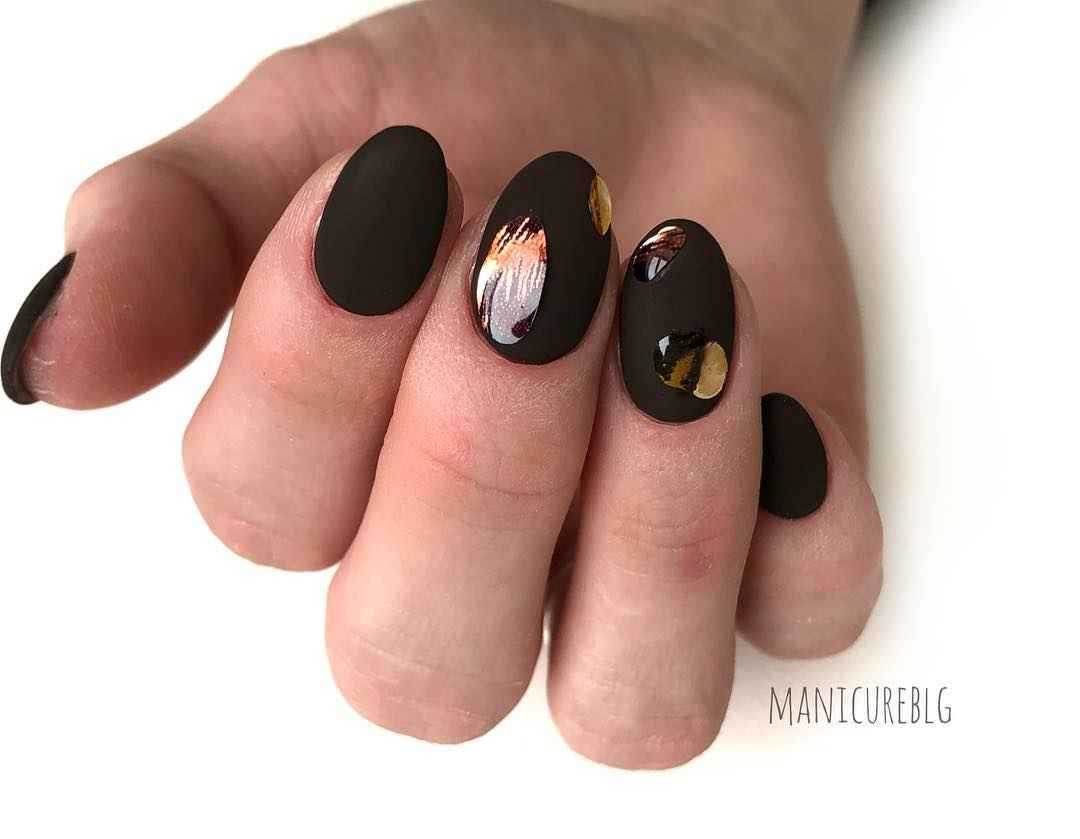 В 2019 году одним из горячих трендов beauty-индустрии считают матовый черный маникюр. Он уже который год радует поклонниц матовых тонов своим разнообразием. Модный матовый маникюр в черном цвете — универсален. Он неброский, не вызывающий и подходит даже для похода на работу. Матовый черный лак отлично дружит с блестками различных тонов и фольгой металлического цвета. Данный маникюр выглядит безупречно на коротеньких ноготках миндальной или овальной формы. Более элегантно и даже немного провокационно смотрится черное матовое покрытия на острых, длинных ногтях. Матовый цвет сам по себе выглядит нежно и скромно, но если вам все же хочется разнообразить монотонность, фантазируйте с дизайном, добавляя разные материалы декора.