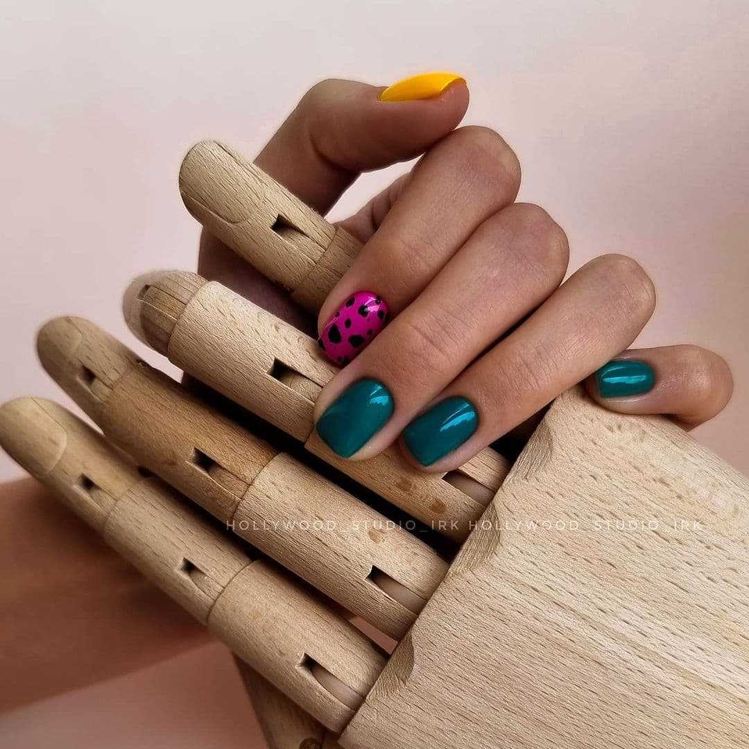 - Следующее направление — цвета насыщенной гаммы, которые отлично подойдут к коротким ногтям квадратной или широкой формы.