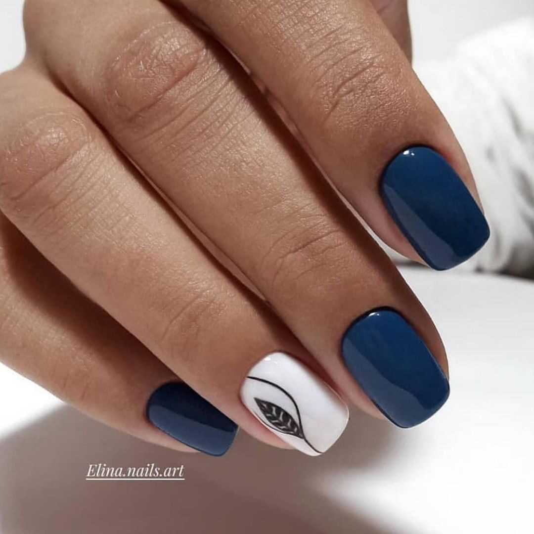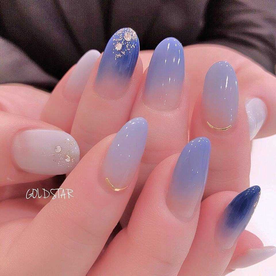 Синий — цвет, который поучаствовал в образовании оттенков фиолетовой гаммы. А значит он отлично подойдет для сочетания с сиреневым. Здесь отлично смотрится геометрический дизайн, градиент — вертикальный и горизонтальный, кошачий глаз, сочетание с синима хлопьями юкки на сиреневом фоне, втирка.