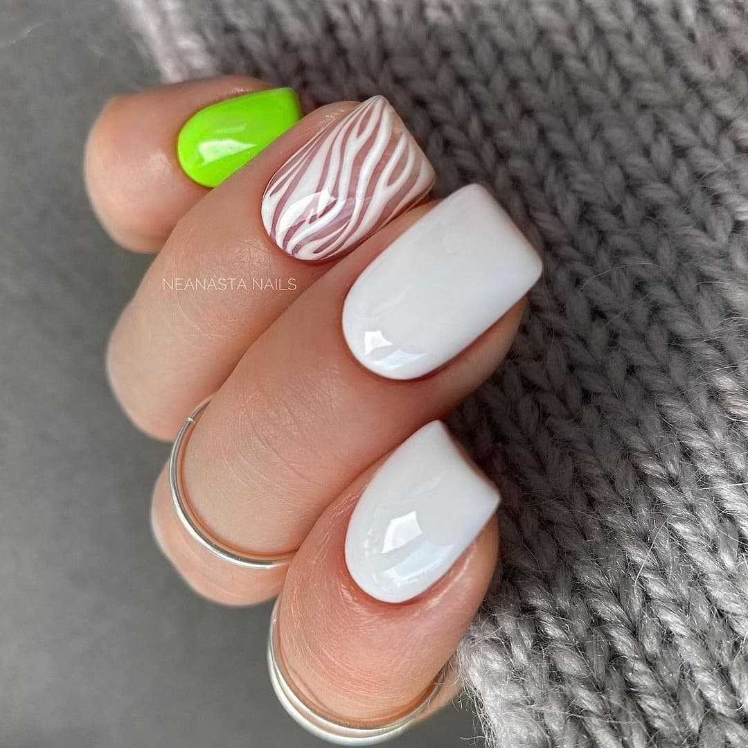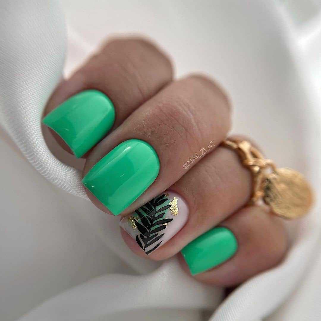На фотографиях актуальные дизайны стильно смотрятся со всеми оттенками: от салатовых и неоновых до благородно-изумрудных. На лето особенно актуальны цвет молодой травы и нежный приглушённый ментол.