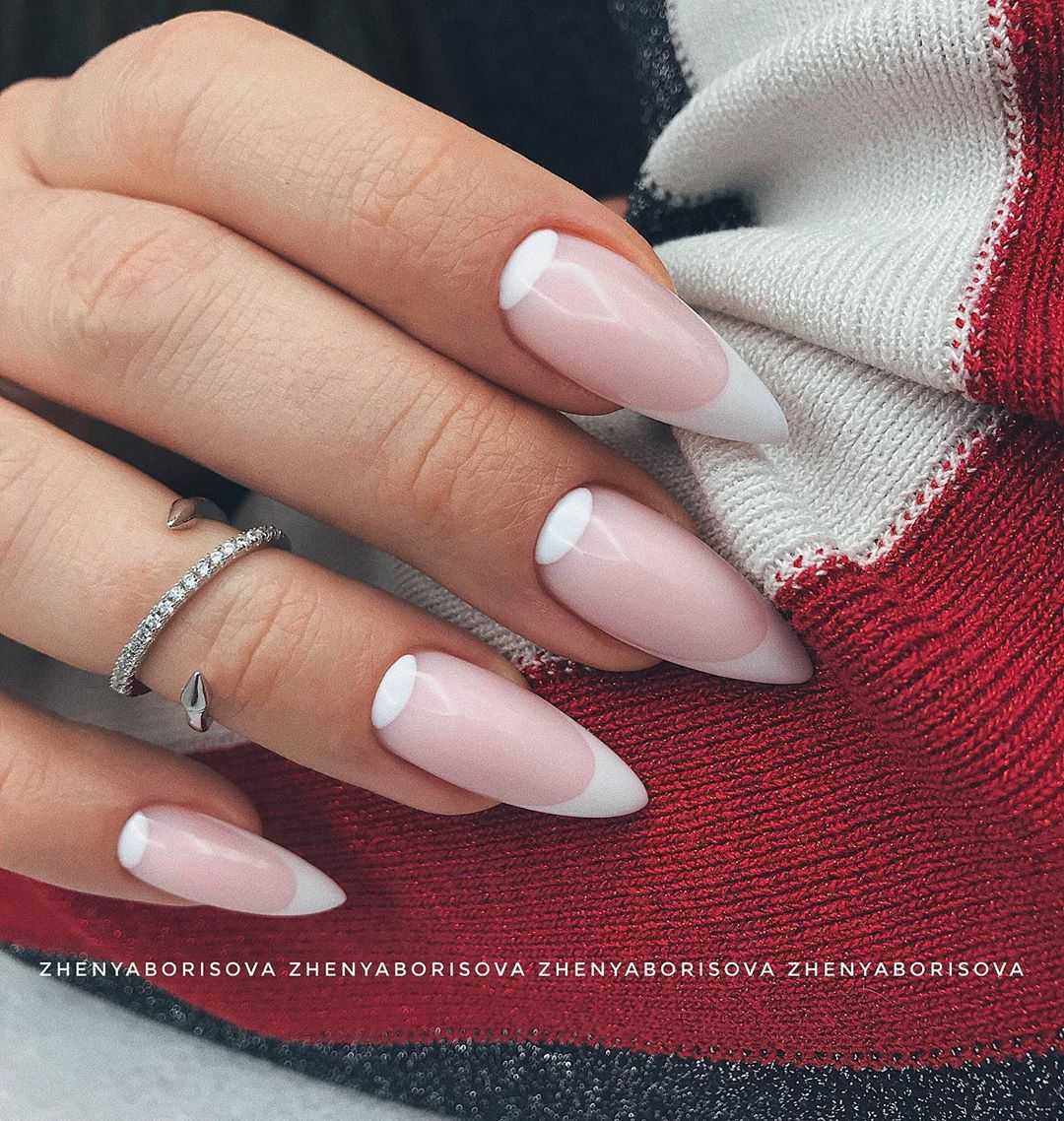 Оформление на острых ногтевых пластинах френч маникюра можно уверенно назвать беспроигрышным вариантом. Классическое исполнение подразумевает выделение кончика ноготка белым лаком. Другие вариации френча позволяют использовать в маникюре яркие оттенки, блёстки и экспериментировать с формой улыбки. Треугольная, косая, двойная или незаконченная линия френча в этом случае смотрится очень оригинально. Помимо этого, французская техника гармонично сочетается с разнообразными рисунками, что очень актуально для летнего периода. Френч с ромашками, бабочками, морской френч и многие другие примеры лишь часть возможных вариаций оформления.