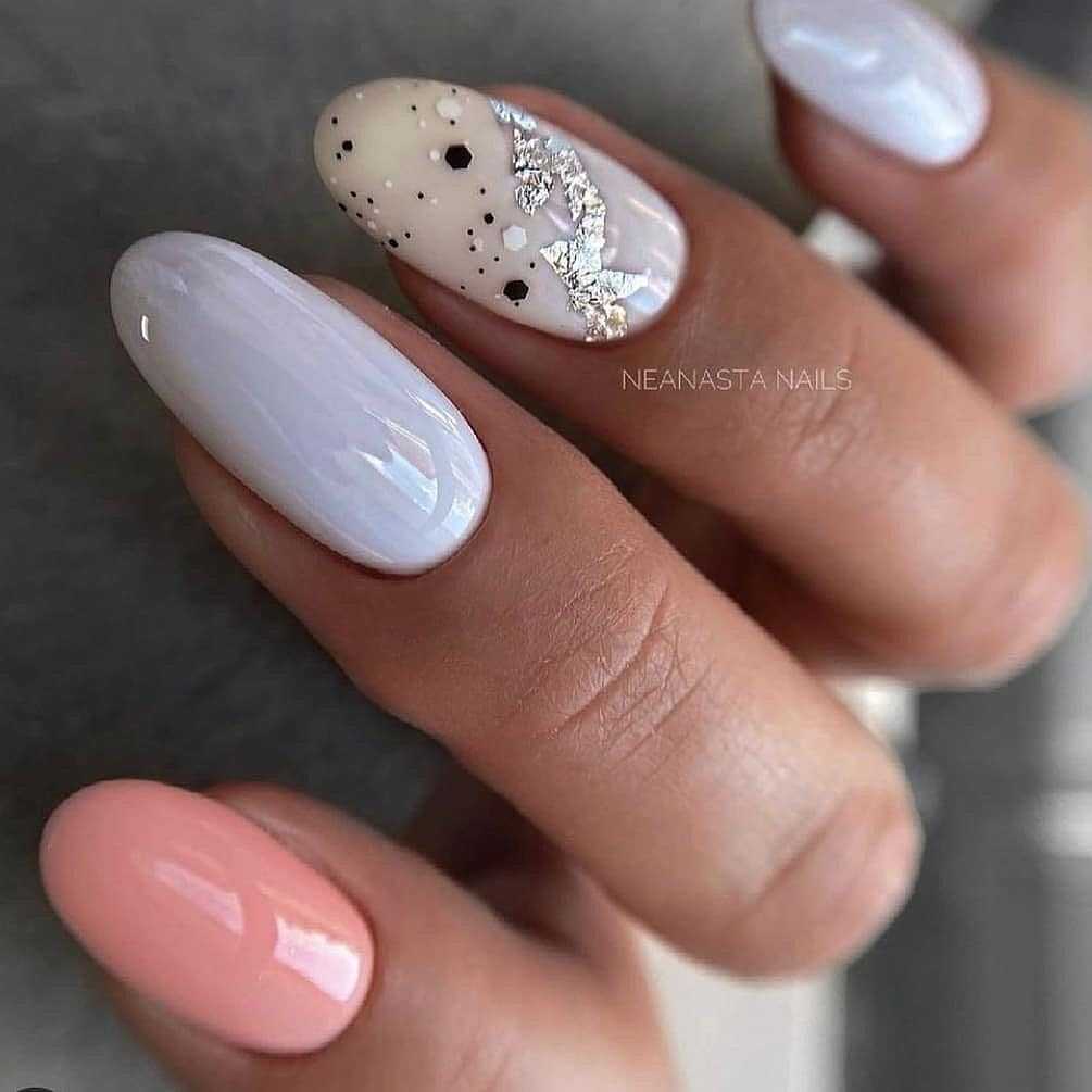 Для создания модного маникюра зима 2022 приемлемо использовать холодную гамму оттенков, например, бледно-голубого, бирюзового либо сиреневого, которые в комбинации с классическим белым в полной мере подчеркнут характер времени года. И конечно не забываем о серебристых блёстках, втирке, блестящей скотч-ленте, фольге, стразах и кристаллах пикси, способных передать ощущение сказки. В этот период актуально украшать маникюр витиеватыми узорами, снежинками, «вязаными» рисунками и прочими изображениями в новогодней тематике. Выделяем для этого пару акцентных ноготков и наслаждаемся результатом.