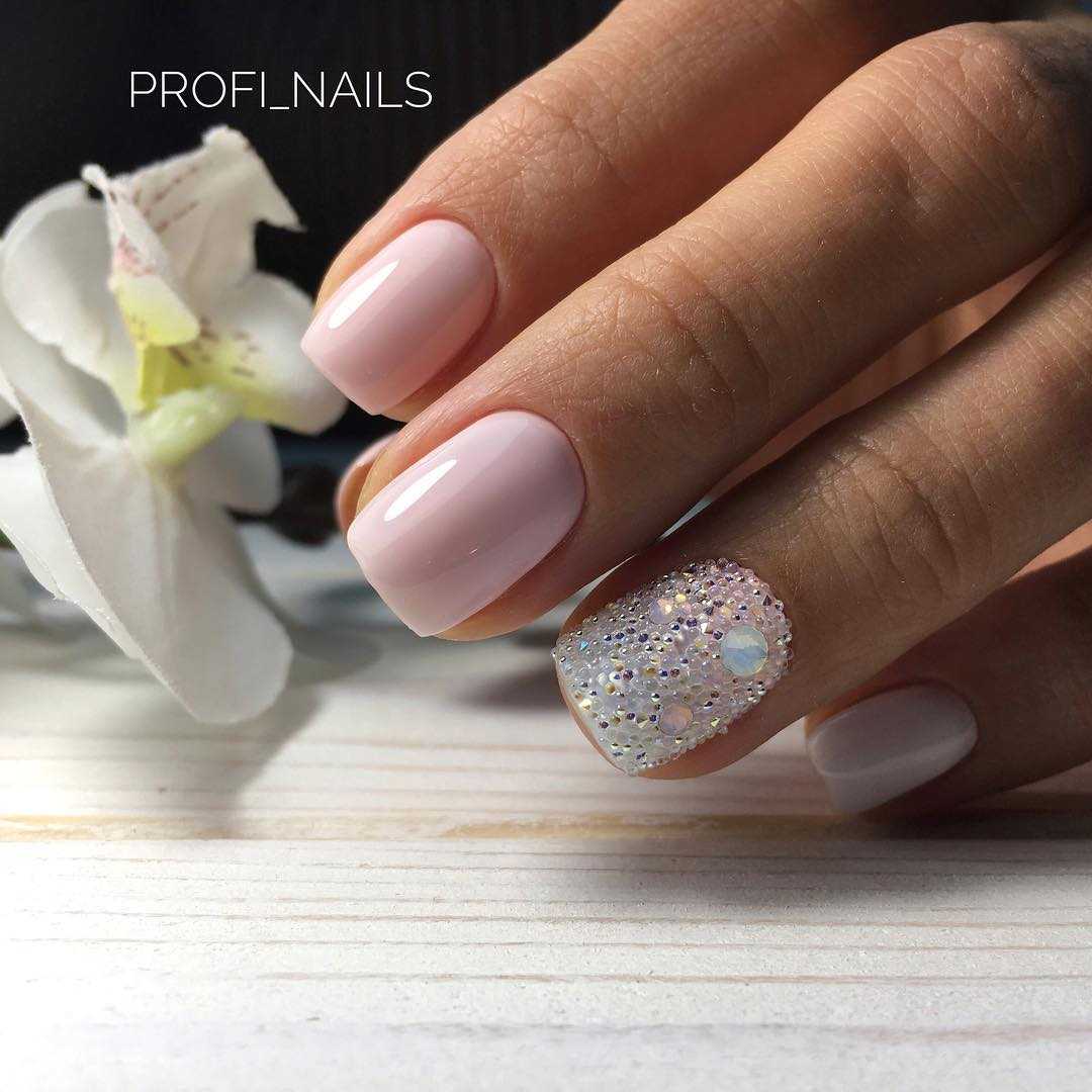 Короткая длина ногтей способна красиво сочетаться не только с многими оттенками покрытий, но и различным декором, например, блёстками. К тому же многие мастера маникюра настоятельно рекомендуют использовать именно эти виды дополнений, поскольку их главной особенностью является отсутствие объёма, что позволит избежать утяжеления дизайна и прекрасно освежит оформление. Нюдовый маникюр с блёстками – это выделение глиттером лунулы у основания и сверкающий френч, оттиски фольги и оригинальные узоры из камифубуки. Также очень красиво смотрится блестящая растяжка на паре акцентных пластин и полное выделение декоративными элементами одного из пальчиков.