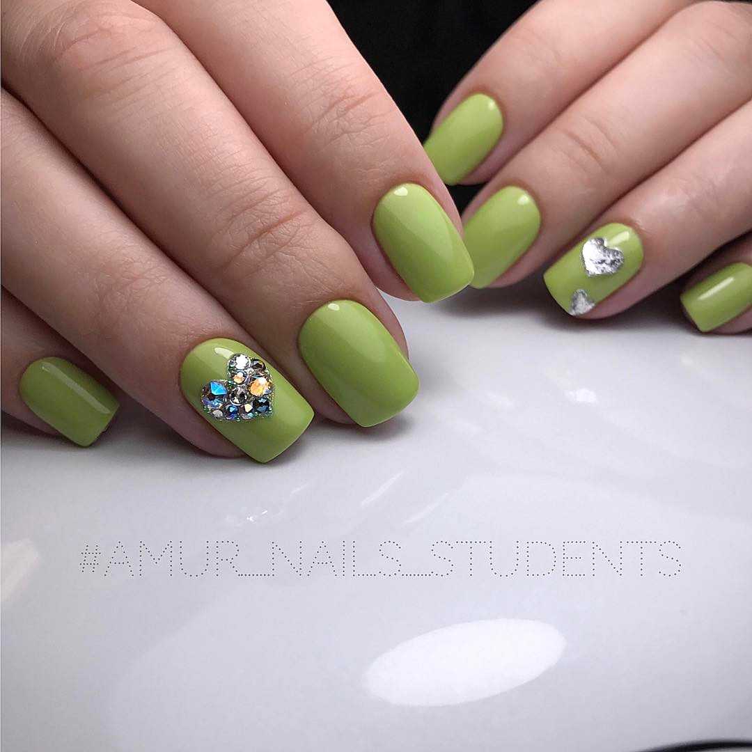 Чтобы сделать зелёный дизайн ногтей вечерним, добавьте на ноготь выкладку из страз. В сочетании с оттенками neon или салатовым камни смотрятся странно, но глубокие изумрудные или пастельные тона стильные кристаллы только преобразят.