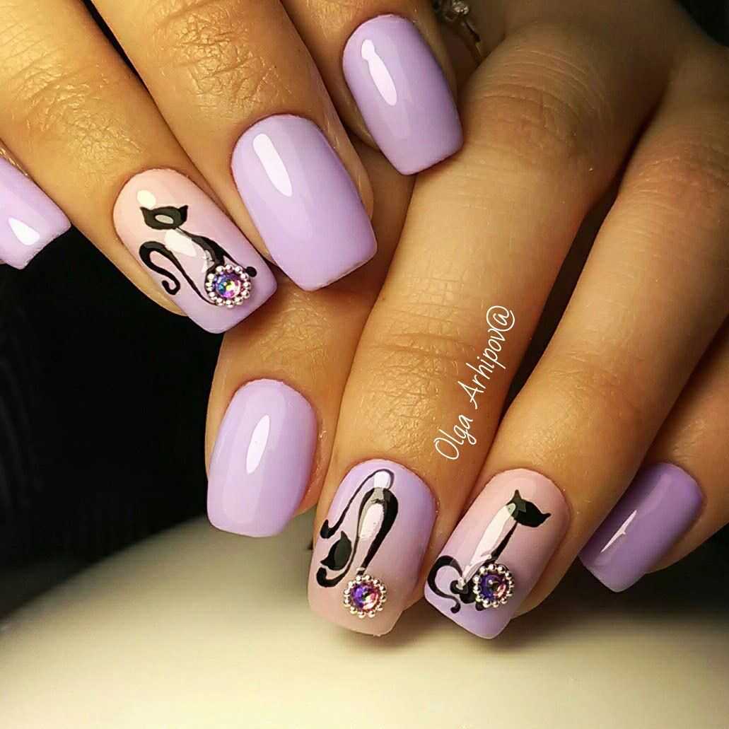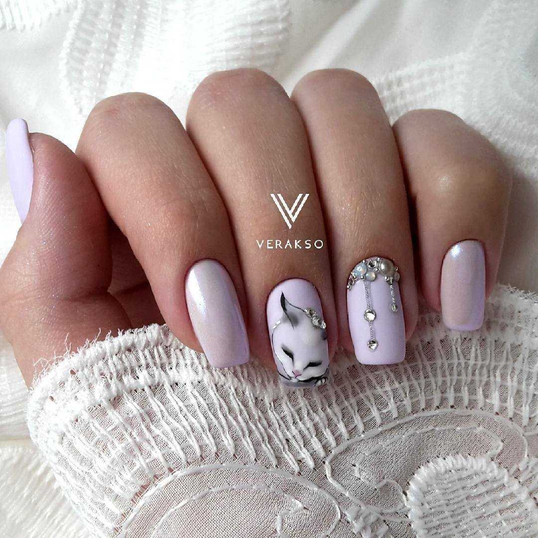 Что касается дополнительного декора, то маникюр с рисунком кошки он лишь украсит