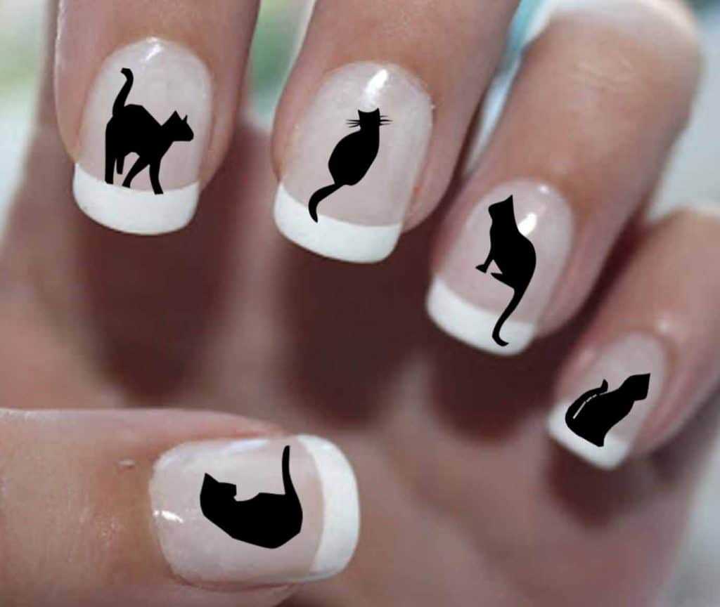 Эксперименты с дизайном стоит начать с одного или двух пальцев и постепенно переходить к остальным ноготкам. Можно закрашивать лишь часть ногтя, как довольно часто поступают при сочетании с французским маникюром. В таком случае край каждого ногтя покрывается кошачьим орнаментом, а остальная часть остается гладкой и естественной.