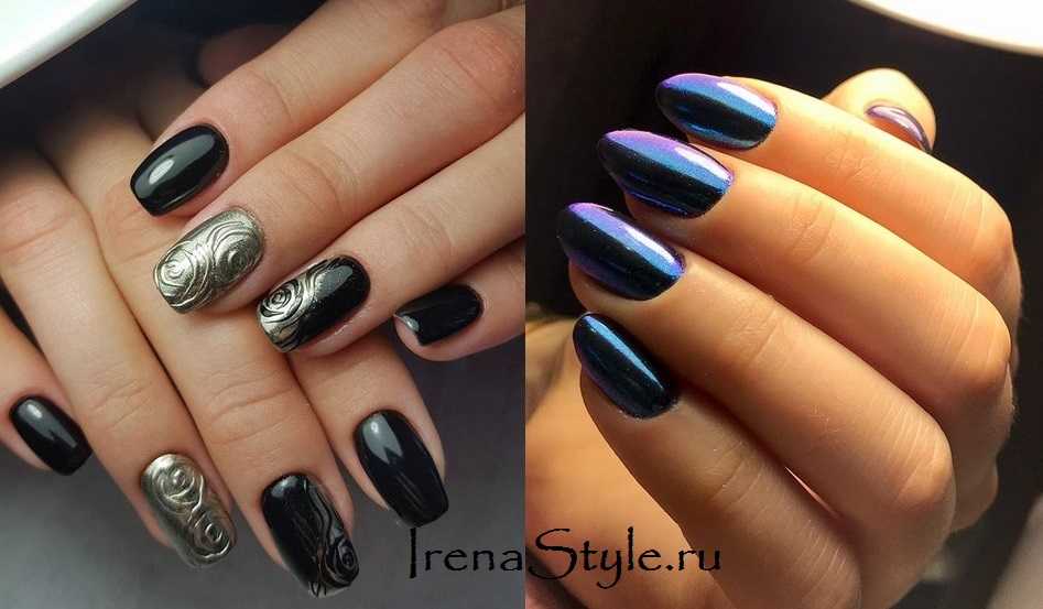 На втором месте по популярности находится ультрасовременный дизайн ногтей с отражающей зеркальной втиркой. Обычно такой пигмент накладывается на самое темное или черное основание для формирования наибольшего эффекта. Зеркальный блеск наиболее выделяется на затемненном основном фоне.