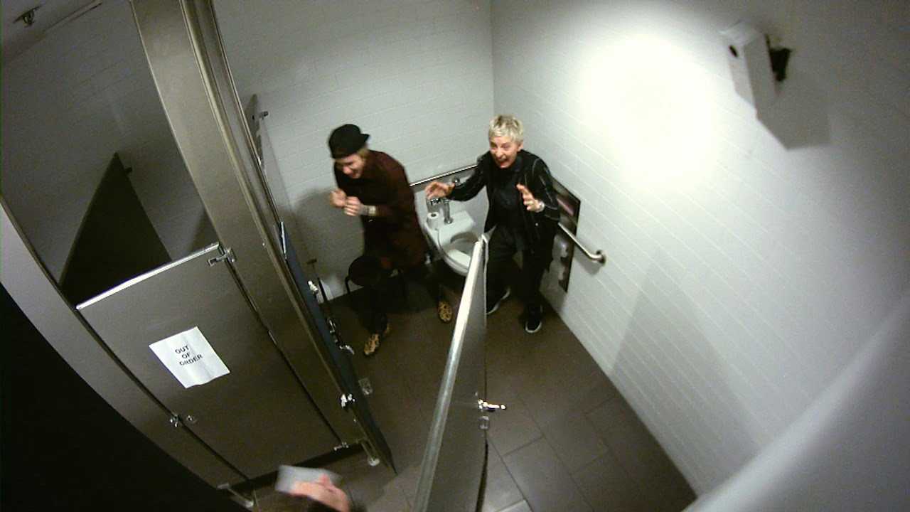 Эллен очень любит пугать своих гостей и зрителей из студии. В этот раз Джастин и Эллен спрятались в туалете для зрителей, и пугали тех кто вошел внутрь. Пранк получился интересным. Многие оправившись от шока, подходили обнять звезд. Кто же откажется обняться с самой популярной телеведущей и певцом?