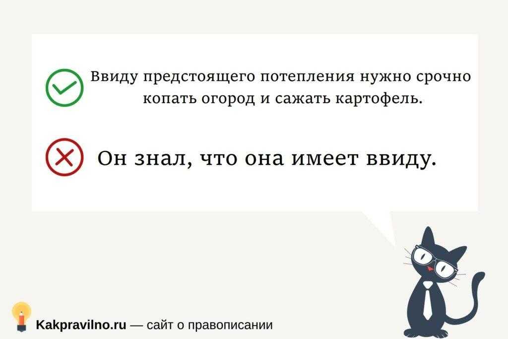 | Корабль показался в виду города. Имей это в виду. | Ввиду недостатка времени (= из-за) я не смог завершить работу (значение причины). |