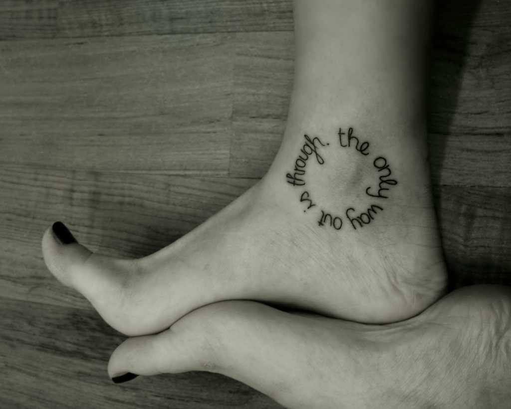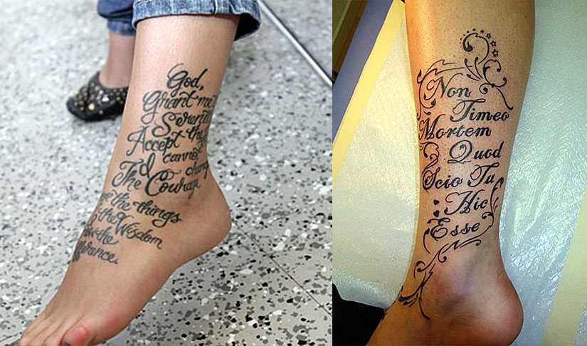 В качестве татуировки в области щиколотки можно выбрать не только различные рисунки и орнаменты, гармонично и оригинально могут смотреться и татуировки в виде надписи. В качестве тату можно выбрать любимое изречение на каком-либо языке, имя (любимого или свое собственное). Иногда люди делают татуировку в виде цифрового кода, нанося на кожу важные и значимые для них даты, (дни рождения или дату свадьбы).