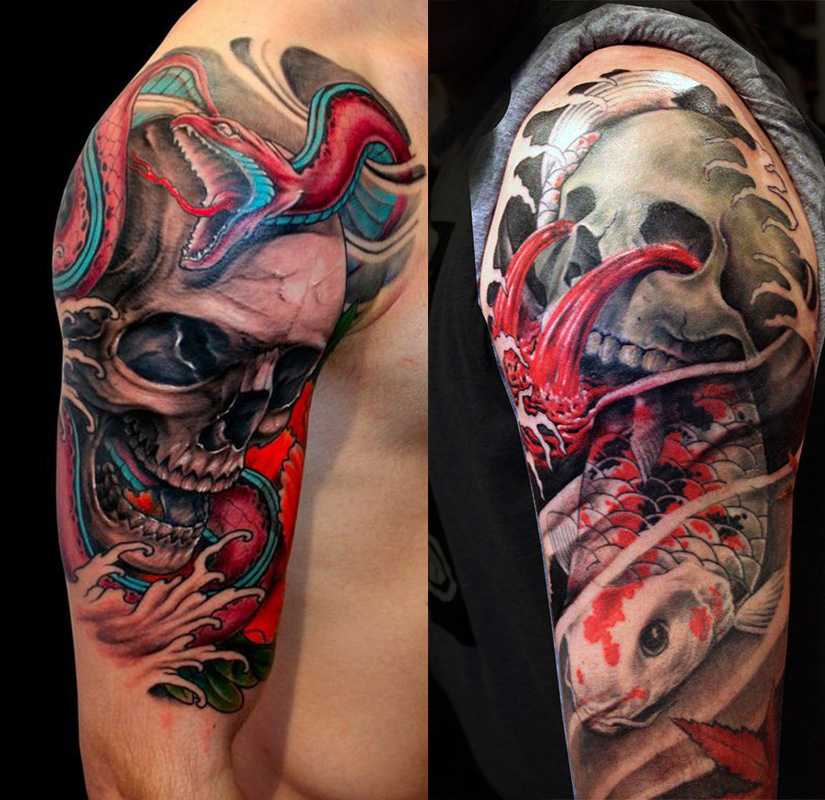 Интересные татуировки на плече черепов с змеей и карпом