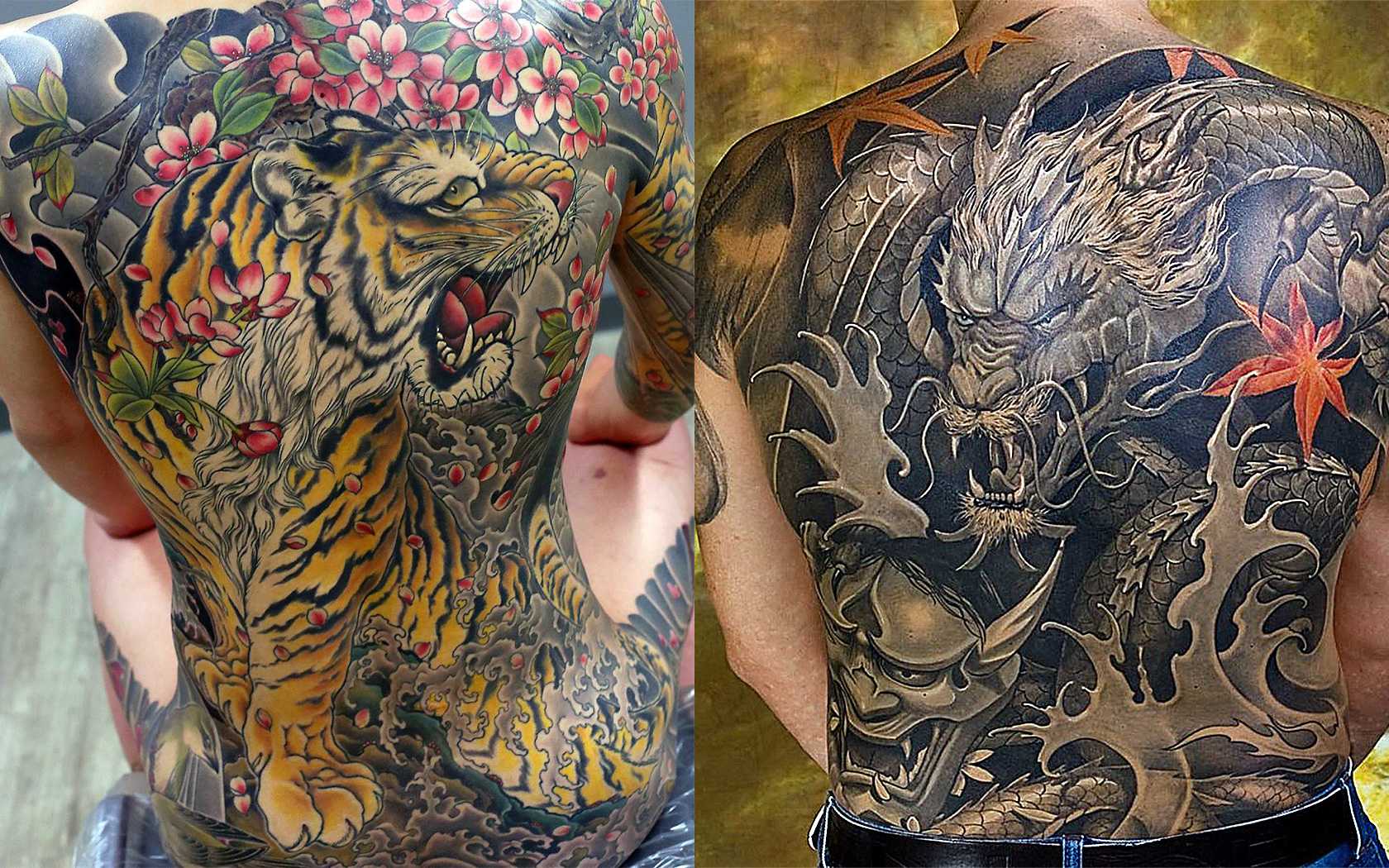 Тату на всю спину в японском стиле, тигр и дракон
