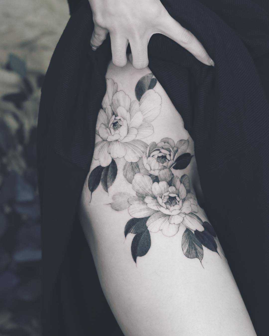 Шикарно смотрятся и подчёркивают изгибы женского тела цветочные мотивы. Это могут быть сложные плетения из вьющихся растений, напоминающих по виду клумбы, пышные букеты или аккуратные одиночные цветочки. Любой из примеров гарантирует стопроцентное восхищение.