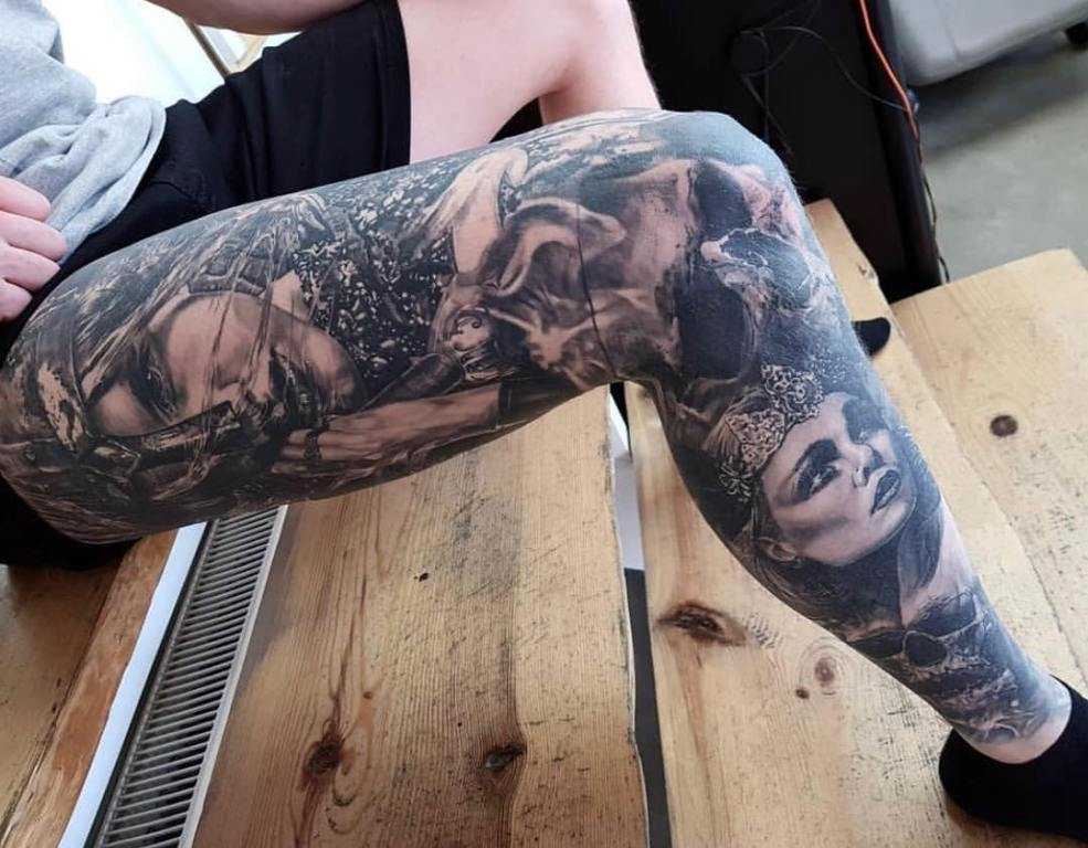 Если вы решились сделать татуировку на ноге, то вам не придется ограничивать себя в выборе эскиза. Хотя, чаще всего мы привыкли делить эту часть тела на такие зоны как бедро, колено, голень и стопа, вы вовсе не обязаны довольствоваться одной или несколькими из них. Можно подобрать шикарный сюжет и набить его на всю ногу. Цветные и монохромные рисунки, крошечные символы и большие картины — решайте, что вам больше по душе.