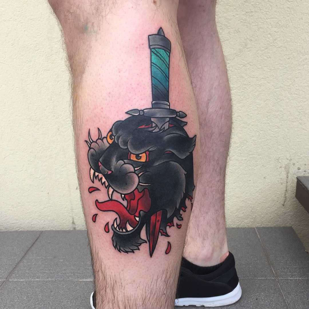Эта татуировка понравится парням, которые предпочитают яркие и громкие татуировки, которые могут олицетворять их дикую сторону! Это страшно и уникально, идеально подходит для тех, кто любит эту яркую цветную гамму.