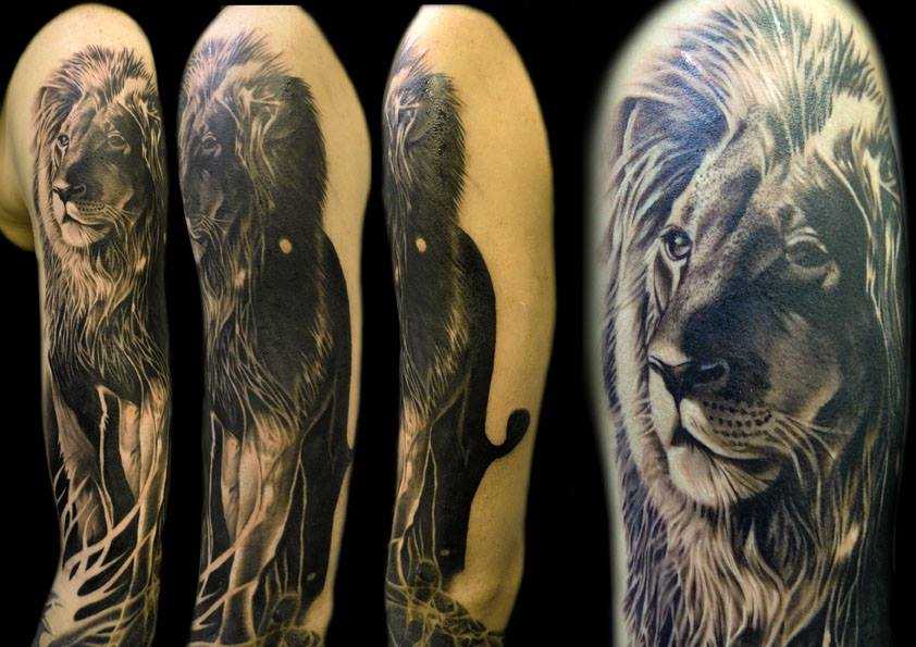 Татуировка в виде льва станет отличным украшением сильного и мускулистого мужского плеча. Принято считать, что чем ближе картинка располагается к лицу своего обладателя, тем больше смысла было вложено в нее. Мужчина старается подражать сильным качествам льва, перенимая черты его характера и поведения.