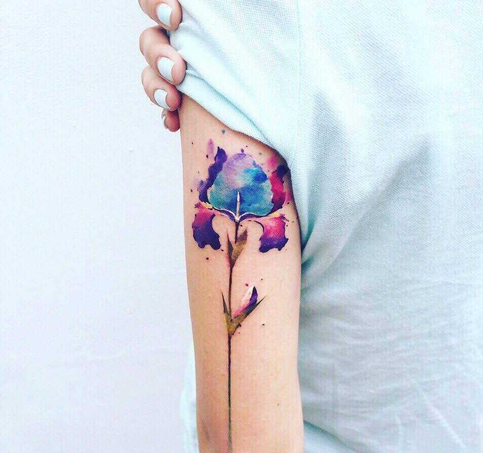 Смелые модницы выбирают цветные эскизы. Иногда ими маскируют шрамы от травм. Цветное изображение на женской руке смотрится красиво, передает индивидуальность личности. В нем используются все доступные оттенки в плотной раскраске или в плавном переходе от одного тона к другому.