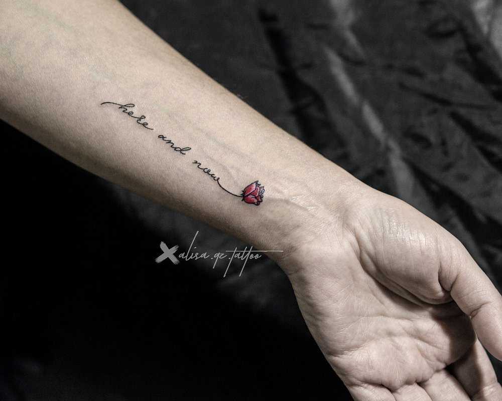 Довольно большим по размеру считается и «полурукав». Часто его делают в виде композиции из разных цветков. За ним следует по размеру классическая небольшая тату на плече или предплечье. Самым маленьким считается рисунок в стиле минимализма. Он заключает в себе некий философский смысл.