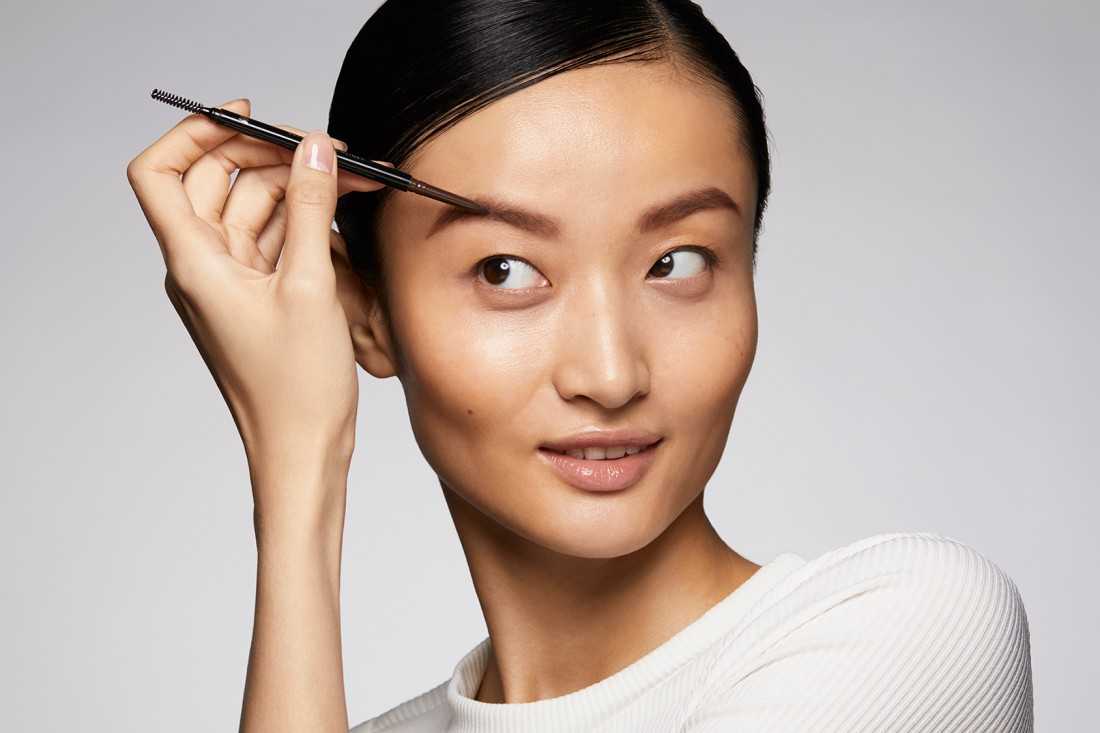 Форма бровей приводится к идеальной. Лишнюю ширину убирают пинцетом. Редкие брови прорисовывают карандашом или тенями. Создают более широкое основание, от которого плавной дугой или ровной линией проводят бровь к узкому кончику.