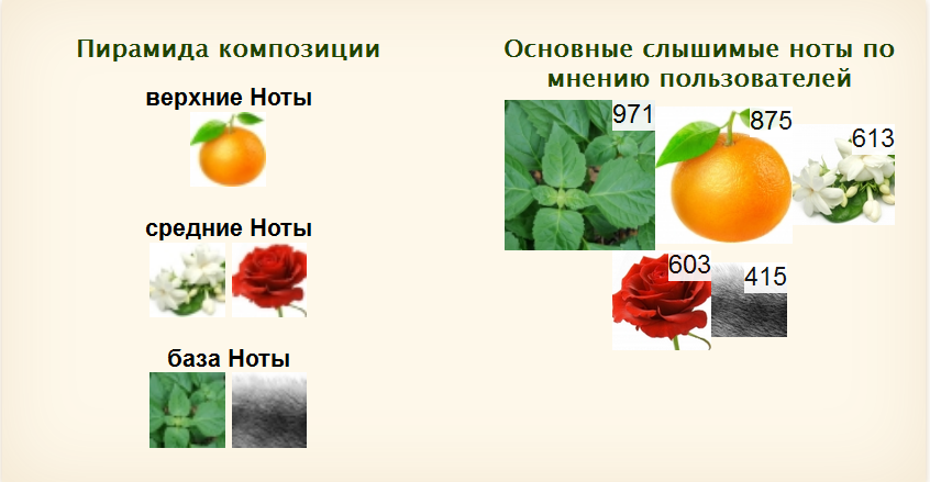 Схема аромата Miss Dior (new) Christian Dior: слева — официальная пирамида композиции, заявленная компанией-производителем; справа — пирамида, определенная потребителями парфюма
