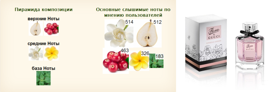 Флакон Gucci Flora Gorgeous Gardenia; официальная пирамида композиции, заявленная компанией-производителем; пирамида, определенная потребителями парфюма