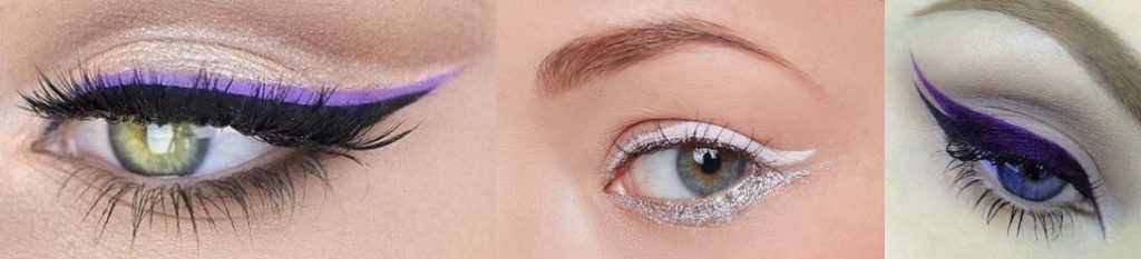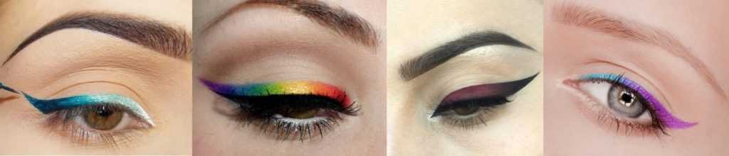 Графичные стрелки. Такие стрелки могут быть тонкими, широкими, кошачьими, с длинным хвостиком или с коротким, но самое главное условие заключается в том, что они должны быть четко очерченными, без растушевки, просветов, зазубрин и прочих неровностей. На фото приведено несколько примеров подобных графичных цветных стрелок.