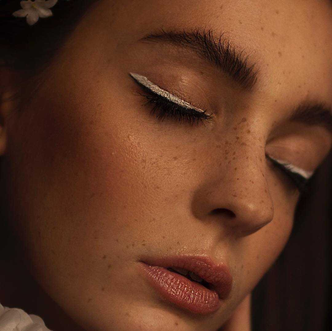 Длинные резкие линии по нижнему веку могли бы выглядеть бунтарски, но белый цвет здесь смягчает эффект. Для такого мейка лучше всего подойдет толстый карандаш с кремовой текстурой, но для четких линий можно использовать и кайал.
